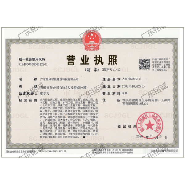 廣東銘誠智能建筑科技有限公司成立于2008年,公司注冊資金為6000萬元,集辦公裝修、酒店裝修、家庭裝修、軟裝裝飾、娛樂場所裝修為一體的裝飾公司,率先提出“創(chuàng)造現(xiàn)代人文空間,挑戰(zhàn)業(yè)界高峰”的雄壯口號,并以此為目標,完成了一大批具有影響力的大型公裝工程:其中包括廣州國際中醫(yī)藥展貿(mào)中心、奧飛澄海音樂廳、澄海區(qū)國家稅務局、澄海興信小額貸款、澄海潮商村鎮(zhèn)銀行、汕頭龍湖賓館、澄海豪庭大酒店、御園國際飲食城、澄海福晉軒酒家、享樂匯保健有限公司、假日商務酒店、尚景康園物業(yè)、星輝車模股份有限公司、奧飛動漫有限公司、香港國際玩具、汕頭萬基貿(mào)易有限公司、泰興源實業(yè)有限公司、汕頭皇冠玩具有限公司等;家裝工程包括南澳黃金海岸整幢的精裝房、中信華府、富春華庭、金信鳳凰名城、凱旋花園、中信金城、柏嘉半島、陽光海岸、金葉島等高等住宅。 ? 廣東銘誠智能建筑科技有限公司經(jīng)過十余年的建筑裝飾裝修施工領域項目積淀,于2018年2月取得“建筑裝修裝飾工程專業(yè)承包二級”、“建筑機電安裝工程專業(yè)承包三級”、“建筑工程施工總承包三級”、“施工勞務不分等級”、“安全生產(chǎn)許可證”等專業(yè)資質(zhì),并于2021年8月建筑裝修資質(zhì)正式升級為“建筑裝修裝飾工程專業(yè)承包一級”。這是對企業(yè)規(guī)模、工程業(yè)績、管理水平、誠信表現(xiàn)的肯定,是企業(yè)實力與能力的展現(xiàn)。 ? 公司每一項工程都始終堅持“精美設計、精心施工、確保合同承諾;勤奮開拓、追求突出、創(chuàng)造時代精品”的質(zhì)量方針,力爭做一項工程,樹一座豐碑。 ? ?銘誠擁有一支由專業(yè)的營銷精英和客戶顧問組成的營銷隊伍,勤奮、敬業(yè)的每一位銘誠員工將本著“贏在別人休息時”的專業(yè)精神,為客戶提供全程營銷及售后服務,確保客戶的合法利益,提供體貼周到的服務,做到讓顧客滿意。 ? 銘誠擁有一批資老牌室內(nèi)環(huán)境設計師,以“現(xiàn)代人文空間”為設計理念,為客戶提供人性化、差異化、智能化的室內(nèi)環(huán)境設計服務,準確的將人性化特點與室內(nèi)環(huán)境相融合,達到了“現(xiàn)代人文空間”的和諧統(tǒng)一。 ? ? ? ?自主創(chuàng)新、視社會責任為己任的精神使我們在發(fā)展的道路上屢獲殊榮:不斷提升的銘誠品牌知名度和美譽度,靠的是優(yōu)質(zhì)的產(chǎn)品,靠的是不斷提升的營業(yè)績,靠的是國內(nèi)的核心技術和誠信的服務。相信通過銘誠人的努力,銘誠將會不斷以新的姿態(tài)為提升廣大消費者的生活質(zhì)量做好服務,為中國裝飾行業(yè)設計創(chuàng)新做出突出貢獻。 ? ? “忘掉競爭、共